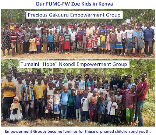 FUMC Fort Worth partners with two Zoe Empowers’ groups in Kenya. The pictures above show our “Precious Gakuuru” and “Tumaini ‘Hope’ Nkondi” Empowerment Groups. That’s a total of 178 orphaned children and vulnerable youth who now are well on their way out of extreme poverty. These children were recruited into the Zoe Empowers program in January 2023.