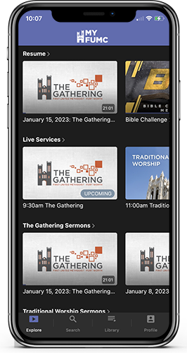 Download the app to your preferred device (App Store is Apple, Google Play Store is Android). You can also simply search “MyFUMC” in your app store’s search engine to find it. The MyFUMC app is also available and can be found in the ROKU Channel Store and on Apple TV devices by searching “MyFUMC” in the app store search engine.